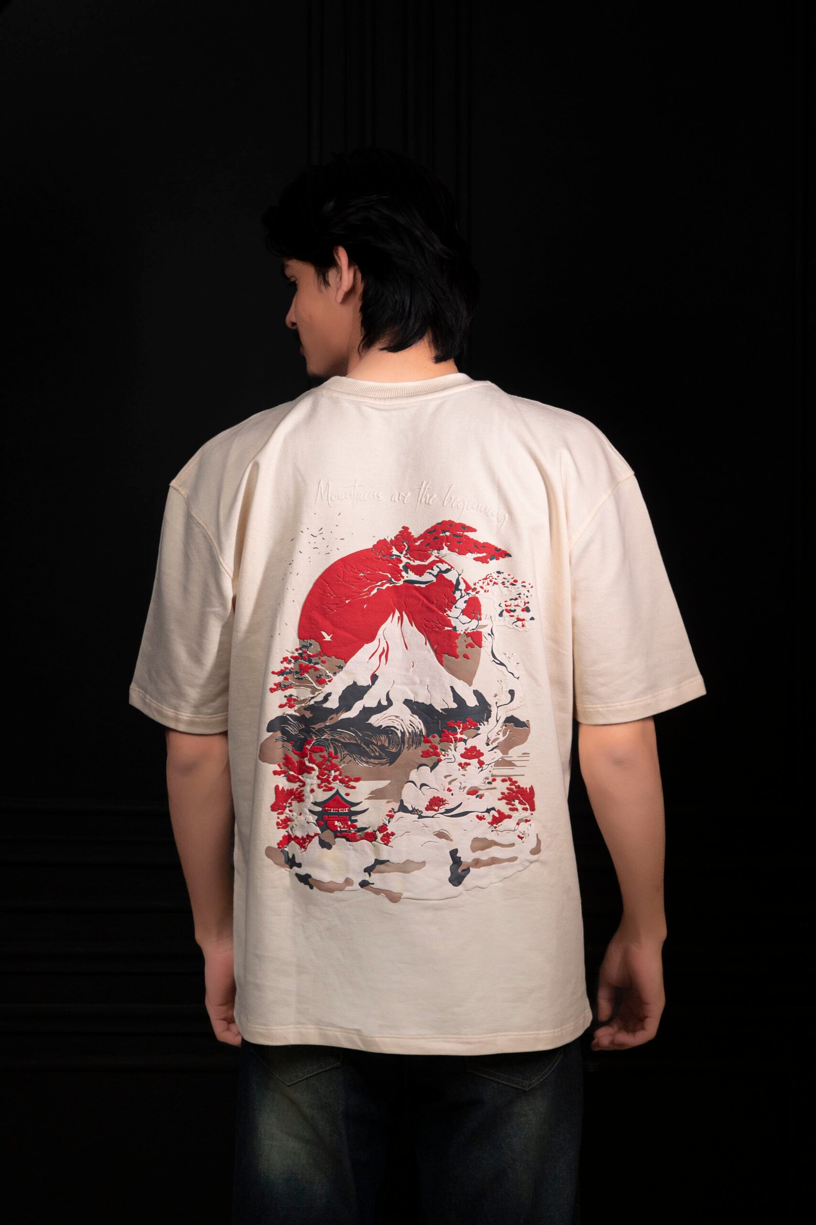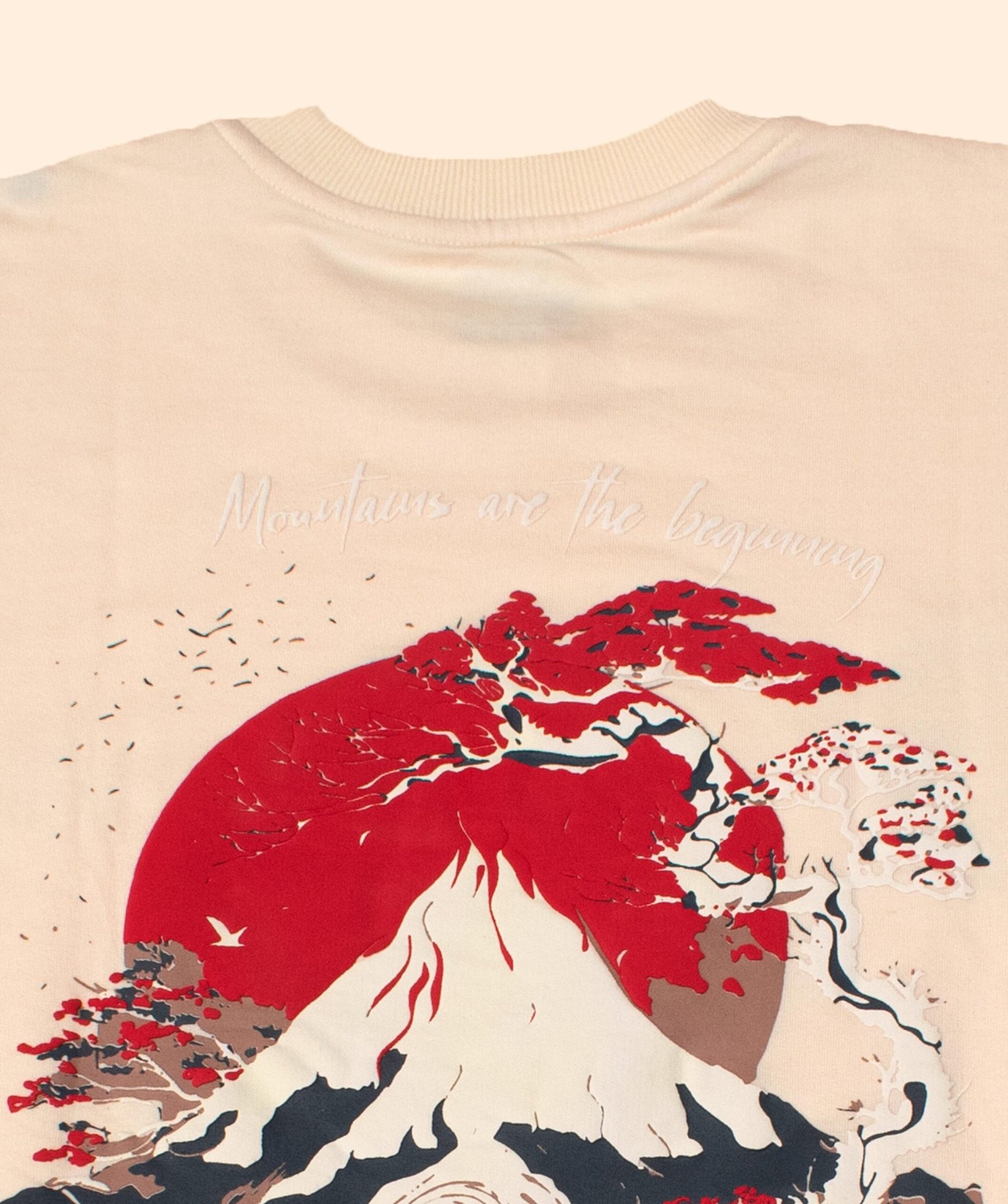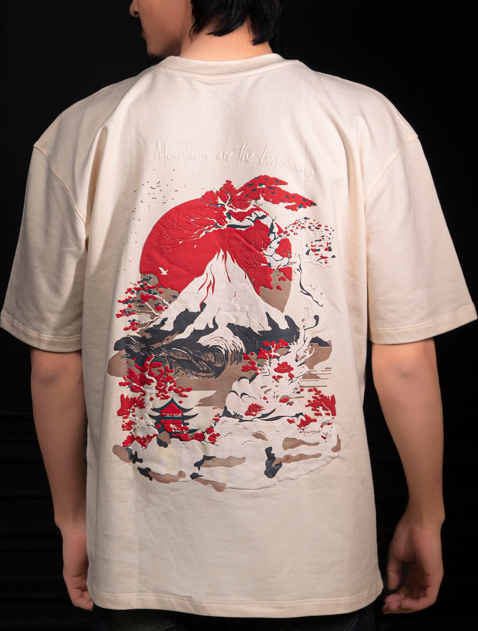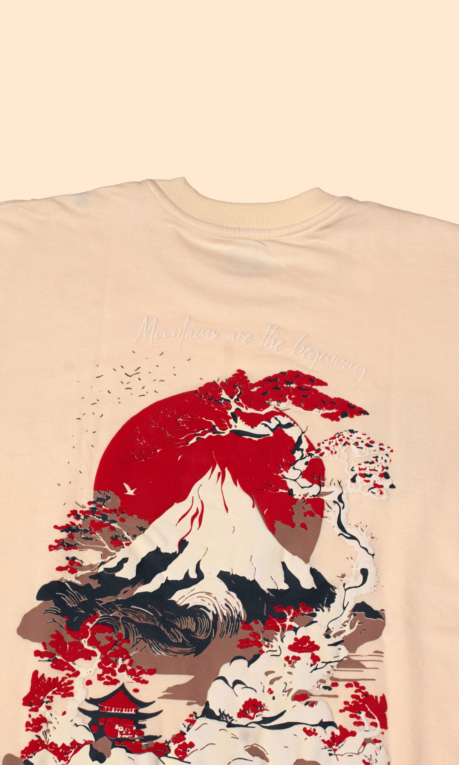A Japanese-inspired artwork featuring a majestic snow-capped mountain beneath a bold red sun, framed by elegant bonsai trees with red blossoms. A traditional pagoda rests peacefully at the mountain’s base, symbolizing balance between nature and culture. The phrase “Mountains are the beginning” highlights strength, origin, and timeless growth. Designed in earthy beige, black, and red tones, this image reflects Thread & Sole’s eco-friendly fashion, sustainable streetwear, and nature-inspired design philosophy.